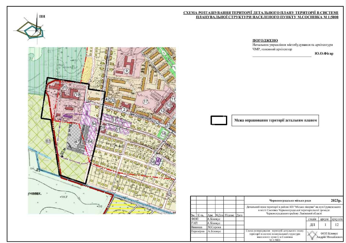 "Детальний план території в районі КП «Міська лікарня Соснівської міської ради»» на вул. Грушевського в місті Соснівка Червоноградської територіальної громади Червоноградського району Львівської області" затверджено рішенням Шептицької міської ради від 19.12.2024 № 3200
