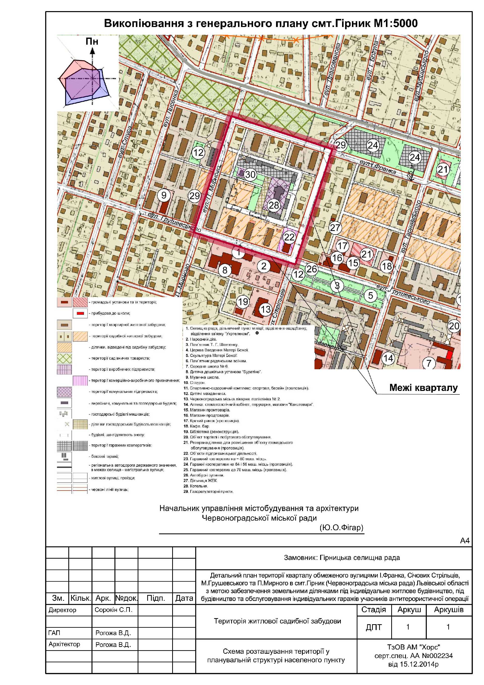Детальний план території кварталу обмеженого вулицями І.Франка, Січових Стрільців, М.Грушевського та П.Мирного в смт.Гірник (Червоноградська міська рада) Львівської області з метою забезпечення земельними ділянками під індивідуальне житлове будівництво, під будівництво та обслуговування індивідуальних гаражів учасників антитерористичної операції , затверджено рішенням Гірницької селищної ради від 24.05.2018 № 161.