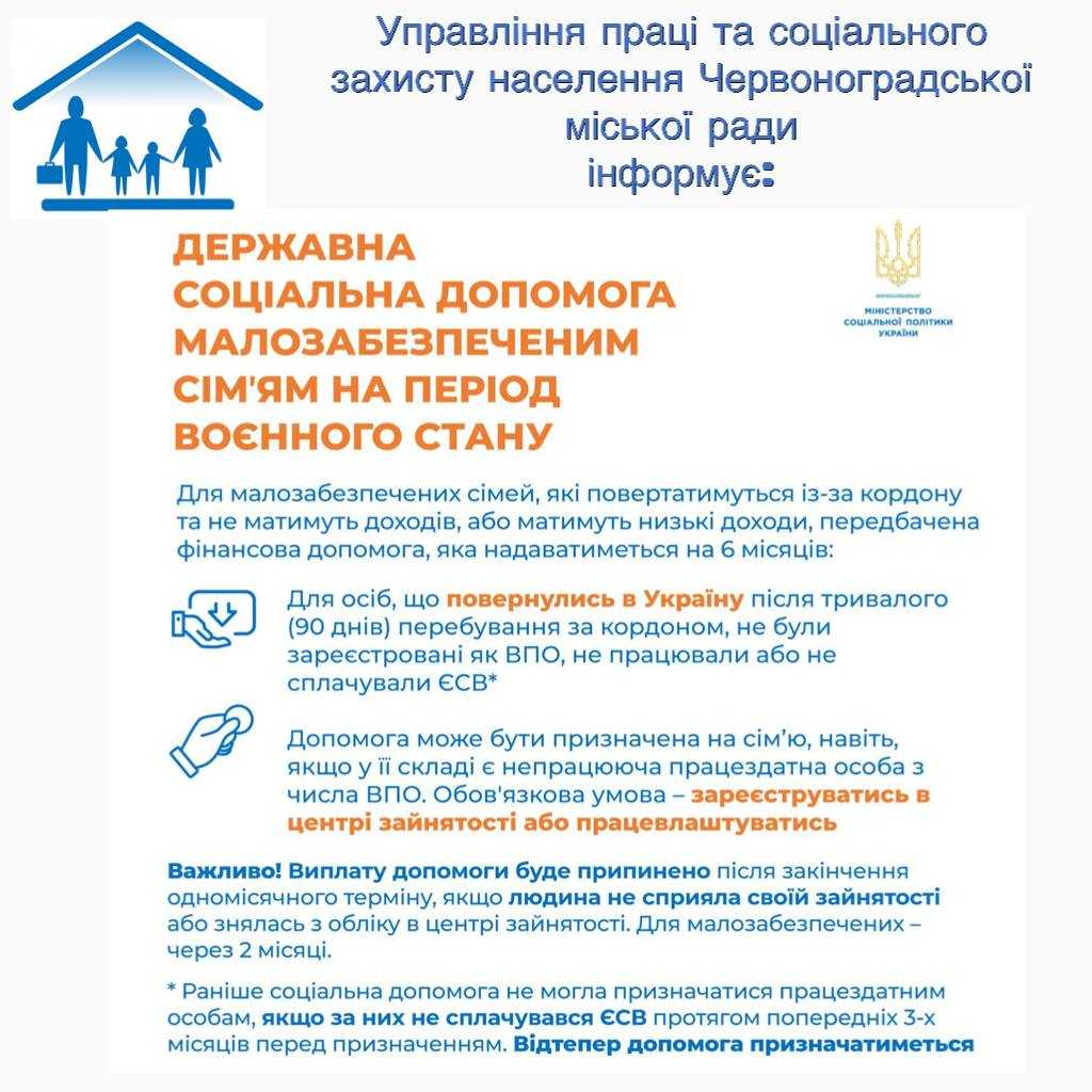 - у складі сім’ї є особи працездатного віку, які доглядають за дітьми до досягнення ними шестирічного віку (включно); дітьми, хворими на тяжкі перинатальні ураження нервової системи, тяжкі вроджені вади розвитку, рідкісні орфанні захворювання, онкологічні, онкогематологічні захворювання, дитячий церебральний параліч, тяжкі психічні розлади, цукровий діабет I типу (інсулінозалежний), гострі або хронічні захворювання нирок IV ступеня, на дитину, яка отримала тяжку травму, потребує трансплантації органа, потребує паліативної допомоги, яким не встановлено інвалідність; особи з інвалідністю I чи II групи; громадяни, які мають трьох і більше дітей віком до 18 років і доглядають за ними; громадяни, які доглядають за особами з інвалідністю I групи або дітьми з інвалідністю віком до 18 років, або особами з інвалідністю I чи II групи внаслідок психічного розладу, або особами, які досягли 80-річного віку; а також фізичні особи, які надають соціальні послуги та отримують компенсацію за надання соціальних послуг, студенти, які навчаються за денною або дуальною формою здобуття освіти в закладах загальної середньої, професійної (професійно-технічної), фахової передвищої, вищої освіти, місце проживання яких не задеклароване/зареєстроване в гуртожитку;