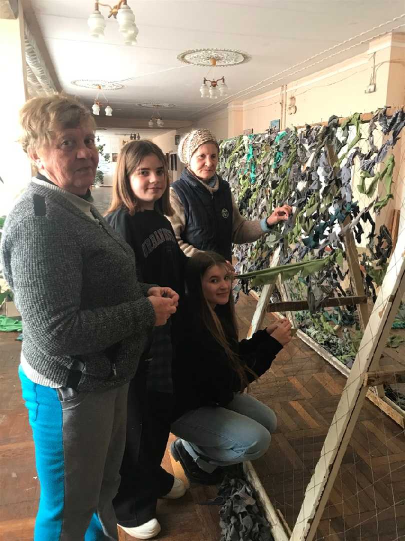 Ми приїхали 12 квітня. Тут нам добре, не мерзнемо, директор школи все для нас приготував. Допомагають волонтери, годують два рази в шкільній їдальні. Нам привезли варення, печиво, чай. Спілкуємося з вчителями школи, допомагаємо на кухні, плетемо маскувальну сітку.