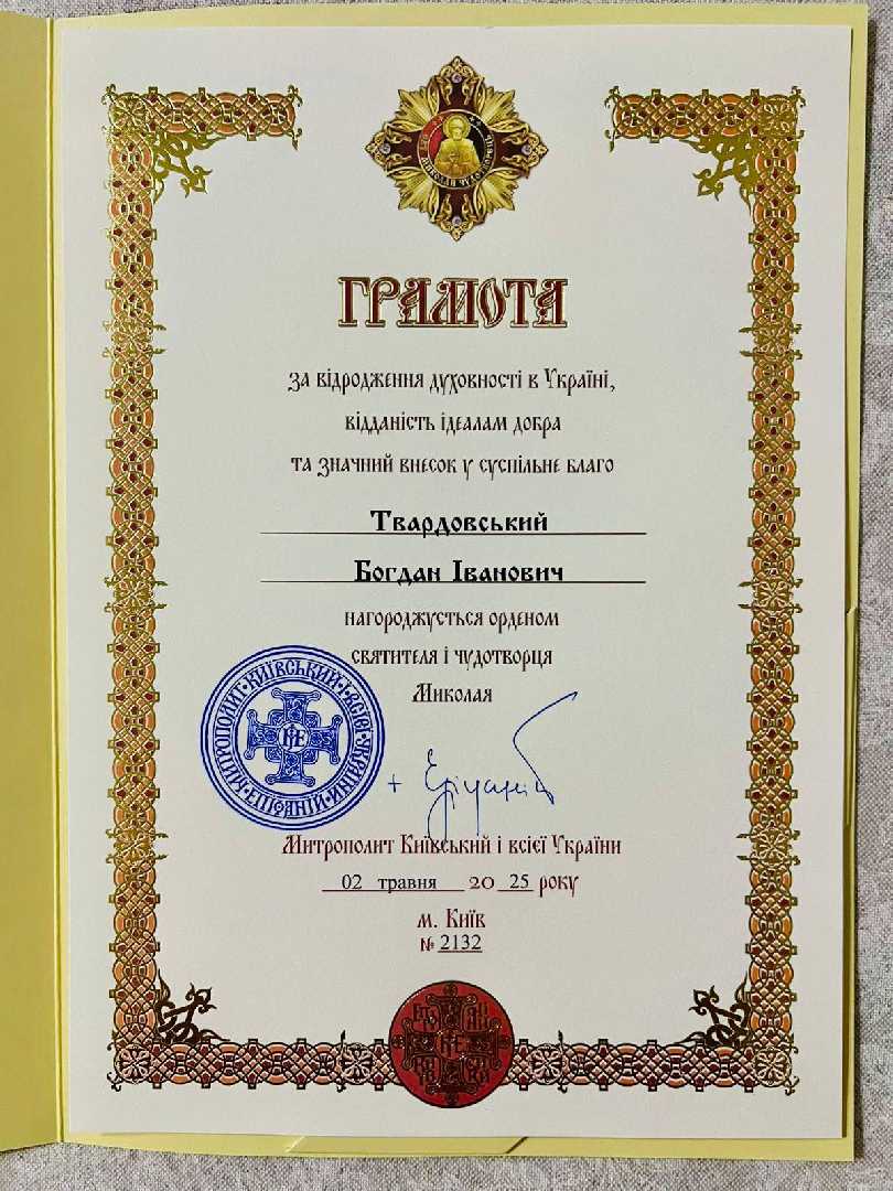 «Як високу честь приймаю відзнаку - Орден святителя і чудотворця Миколая. Щиро вдячний Блаженнішому за високу оцінку зусиль та проявлену увагу. Дякую Господу за можливість Йому служити! Слава Богу! Слава Україні!» - зазначив у соцмережах Богдан Твардовський.