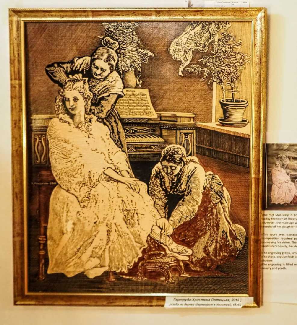 Серед представлених творів — робота майстра деревориту із Шептицького Ярослава Гладкого — «Гертруда-Христина Потоцька». Цей графічний твір присвячений історичному минулому Кристинополя, а саме трагічній історії кохання Станіслава-Щенсного Потоцького. Про особливості роботи та творчий шлях автора гостям виставки розповіла його дружина Світлана Гладка.