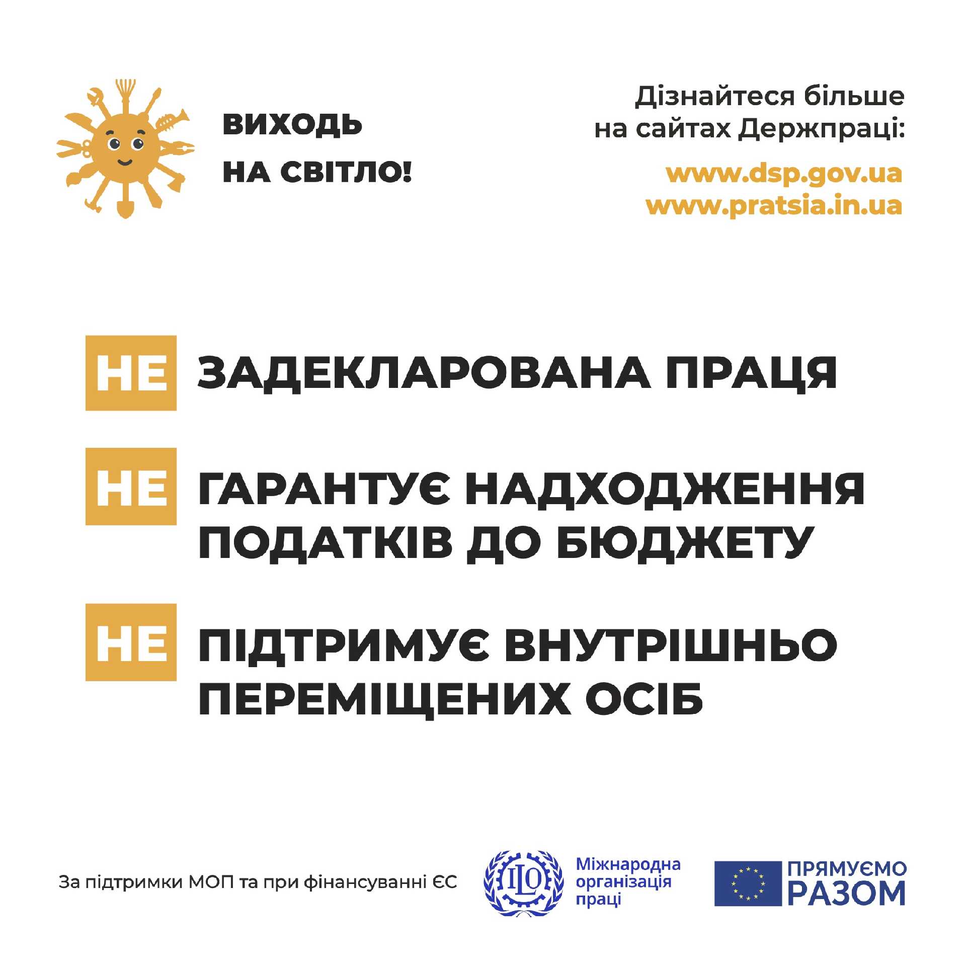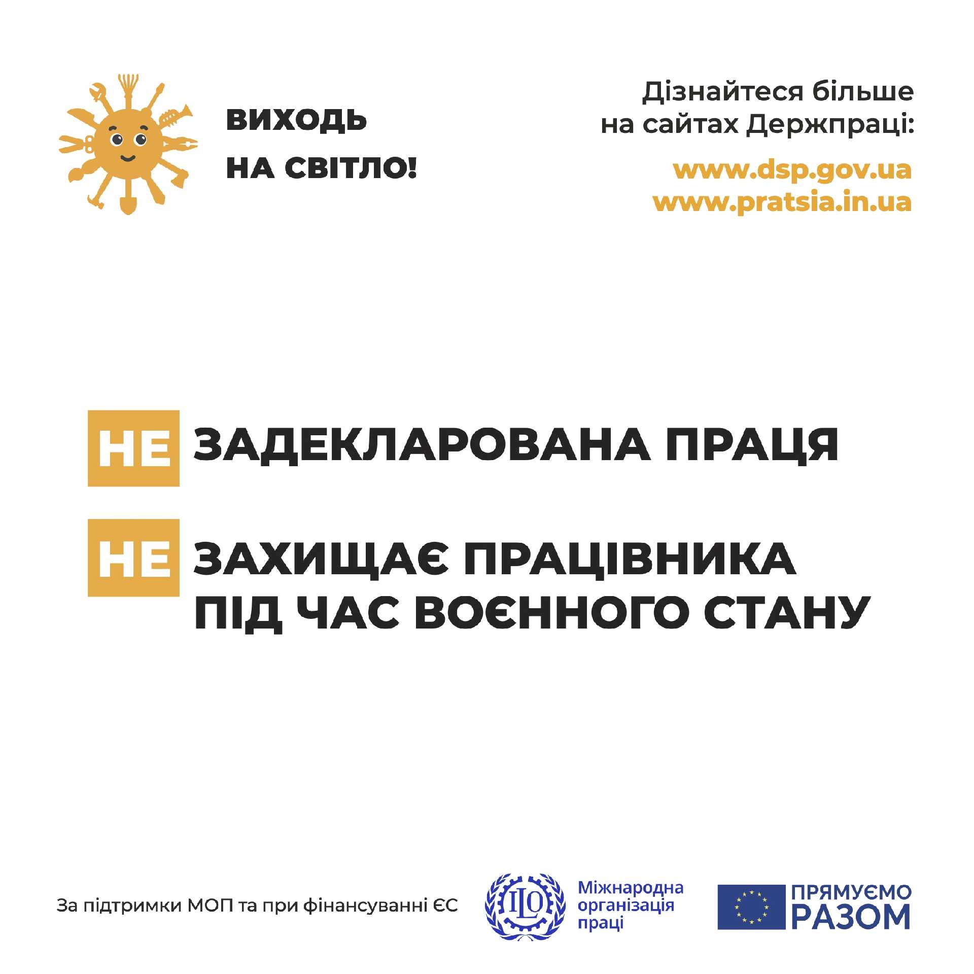 З 1 серпня в Україні стартує інформаційна кампанія Державної служби праці України «Виходь на світло!». Проєкт має на меті інформувати роботодавців та працівників про вимоги законодавства, що стосуються оформлення трудових відносин, та моніторингу стану його дотримання.