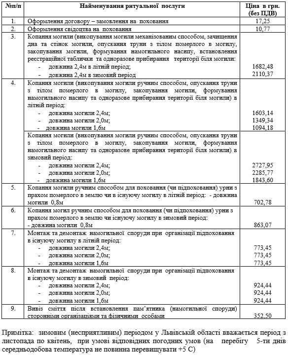 До переліку таких послуг входить оформлення договору-замовлення на поховання; оформлення свідоцтва на поховання; копання могили вручну чи механізовано в літній та зимовий період (включно з опусканням труни, засипанням, формуванням насипу та одноразовим прибиранням території); копання могили для поховання урни з прахом; монтаж і демонтаж намогильних споруд; вивезення сміття після встановлення надмогильних споруд сторонніми організаціями.