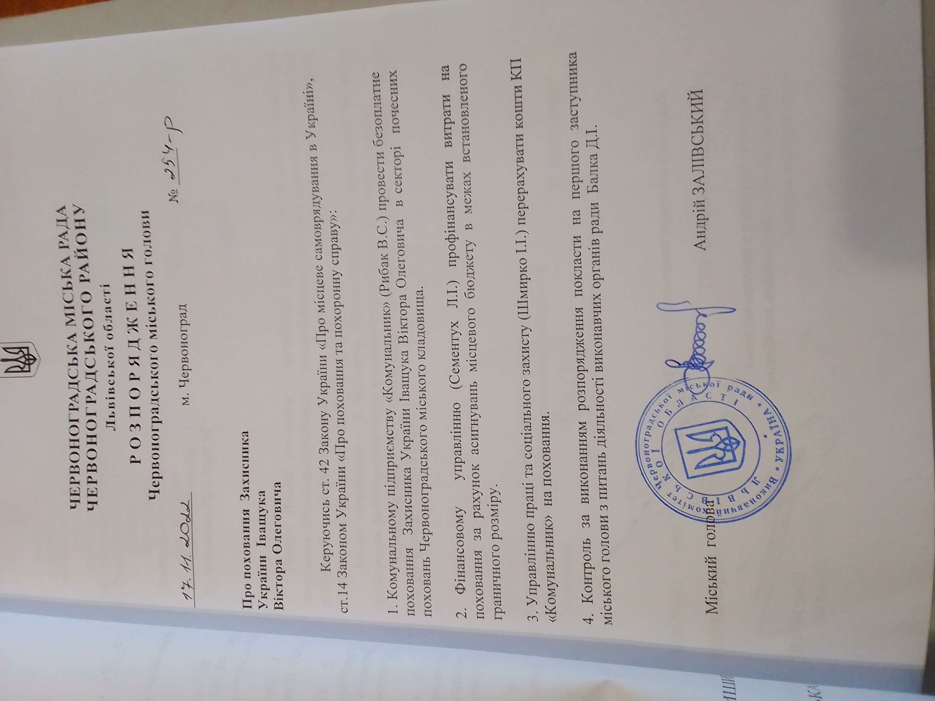 | Номер розпорядження | 254 |